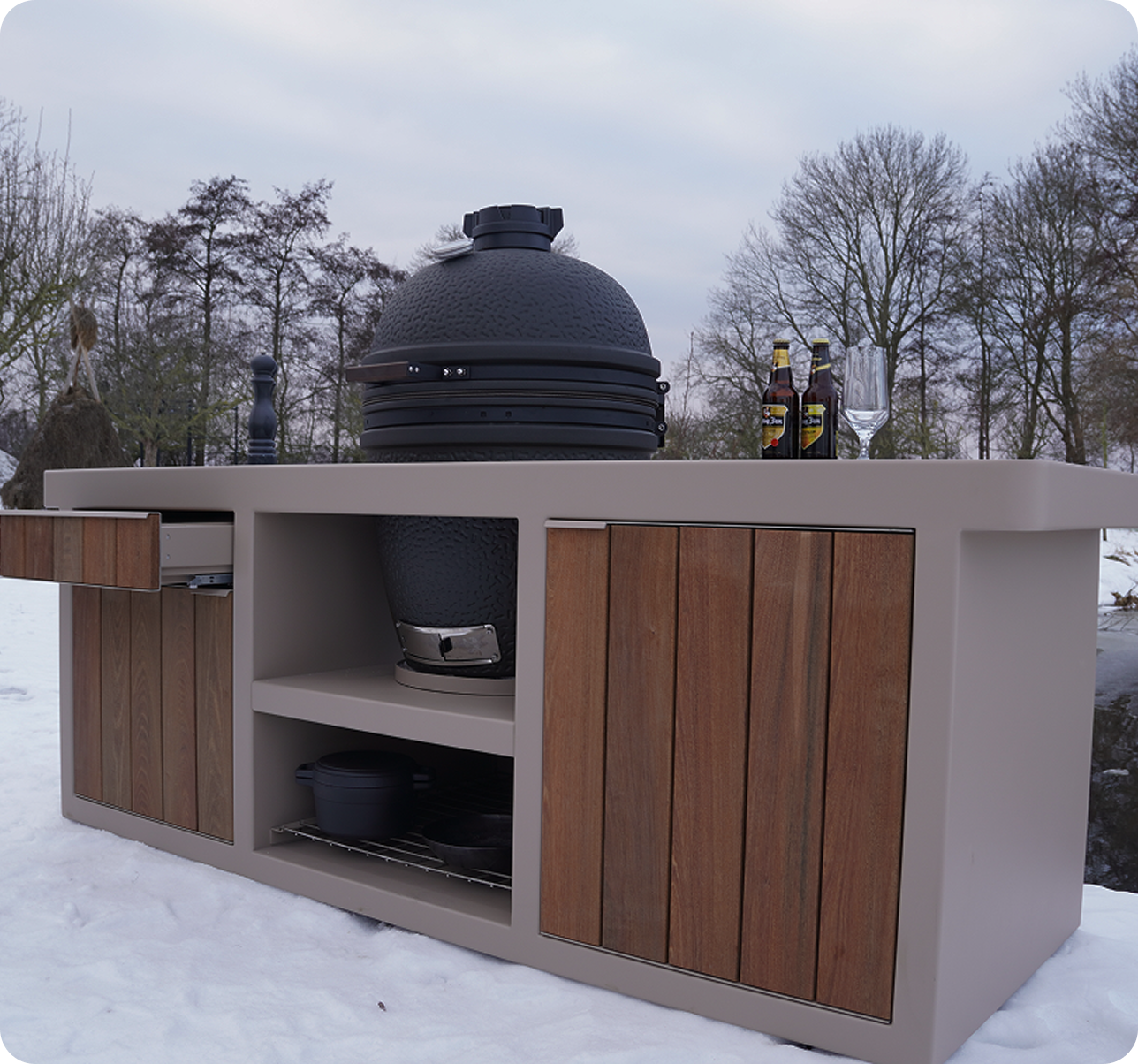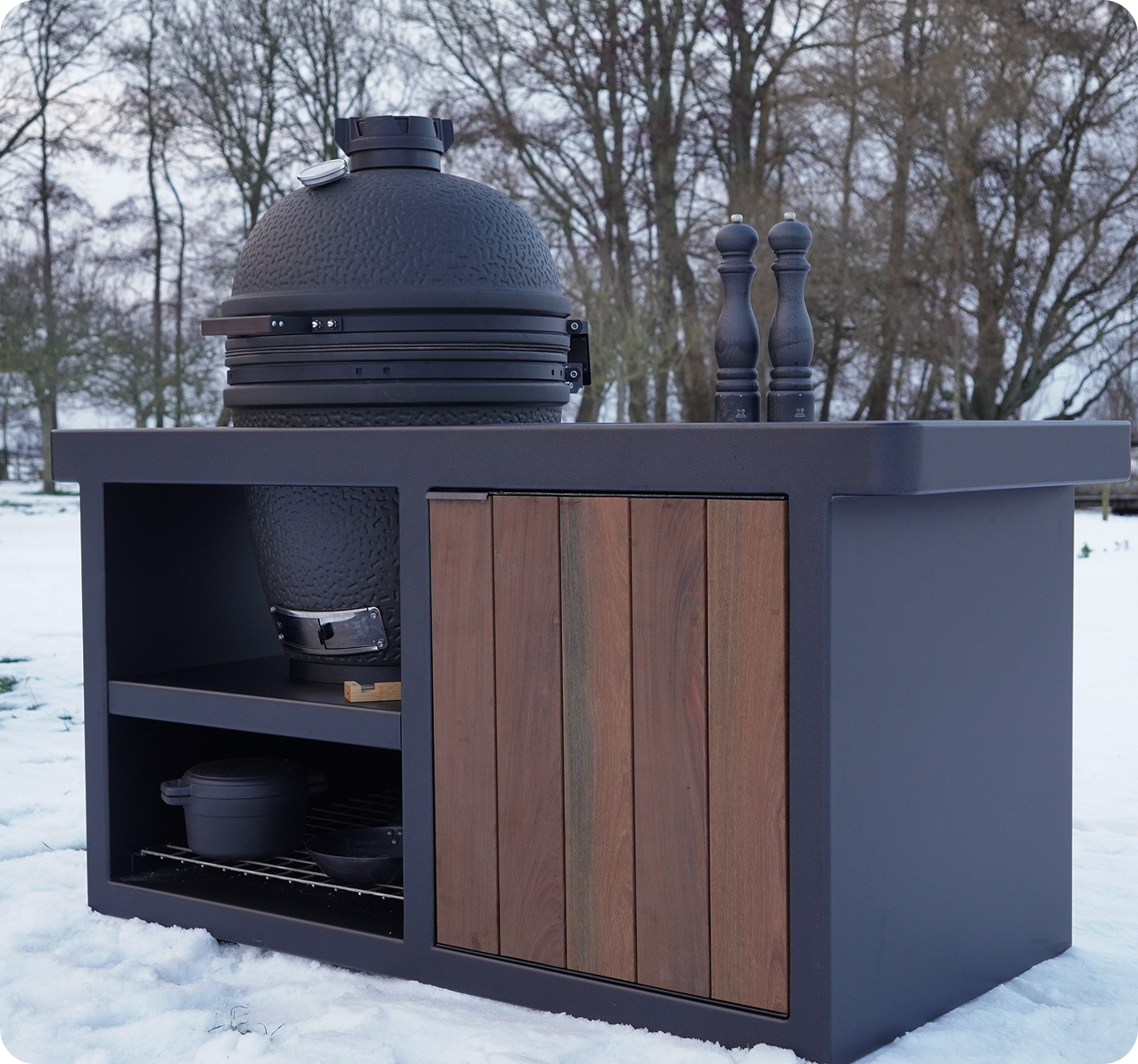 Onze buitenkeukens combineren met een koelkast of wijnkoelkast, stroomaansluiting, lades en kastdeuren, een volledig Dekton blad (7 kleuren) en een standaard RVS-rooster in één strak ontwerp. Ze zijn 100% geschikt voor Big Green Egg en The Bastard (en andere types) en volledig te personaliseren met 12 verschillende coatingkleuren.